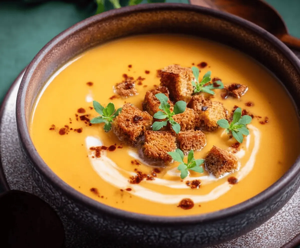 Pour the soup into bowls, drizzle with extra coconut milk, and add croutons on top for some crunch. Finish off with a sprinkle of fresh parsley or cilantro leaves, and if you like a bit of heat, add a few drops of chili oil or crushed red pepper flakes!